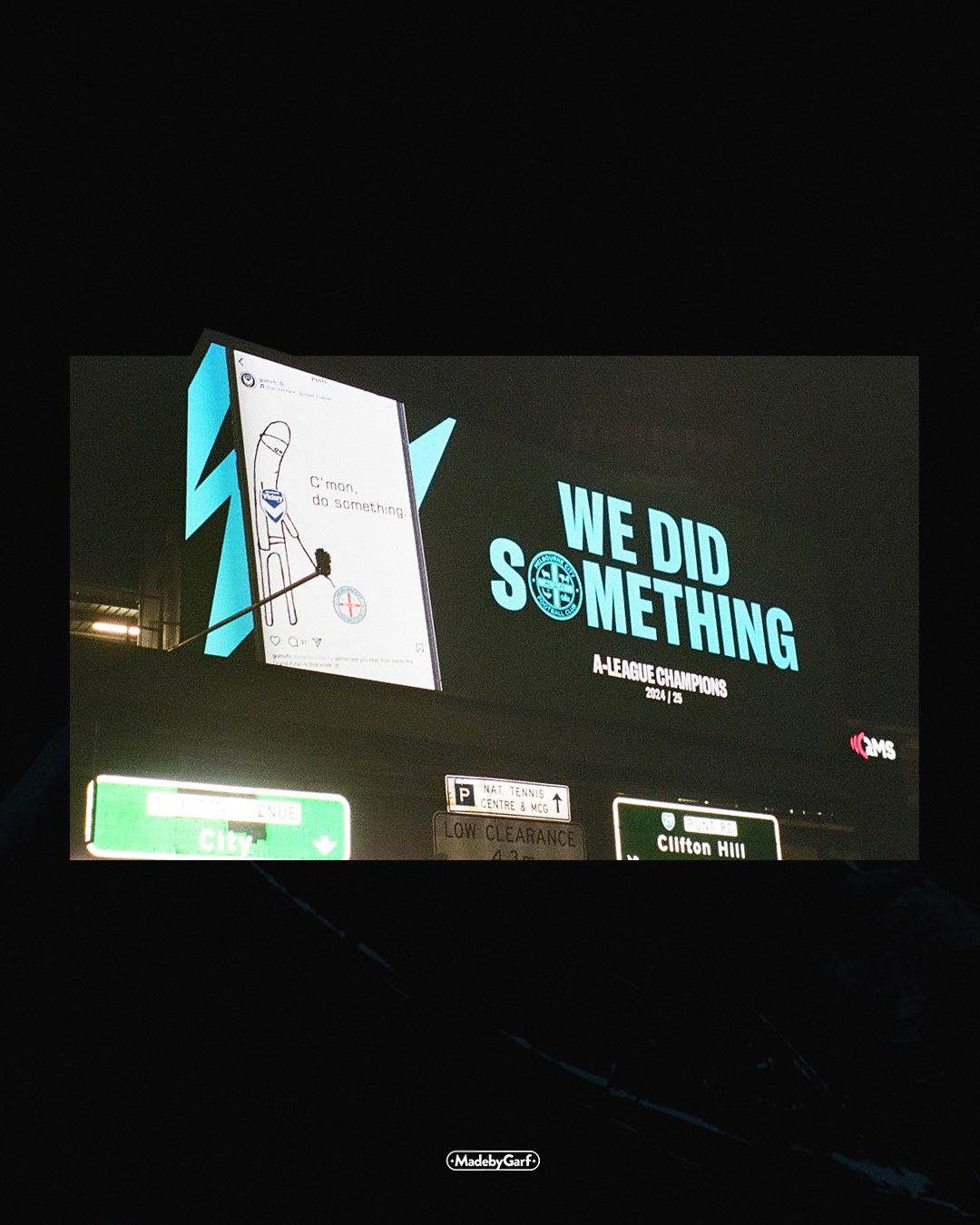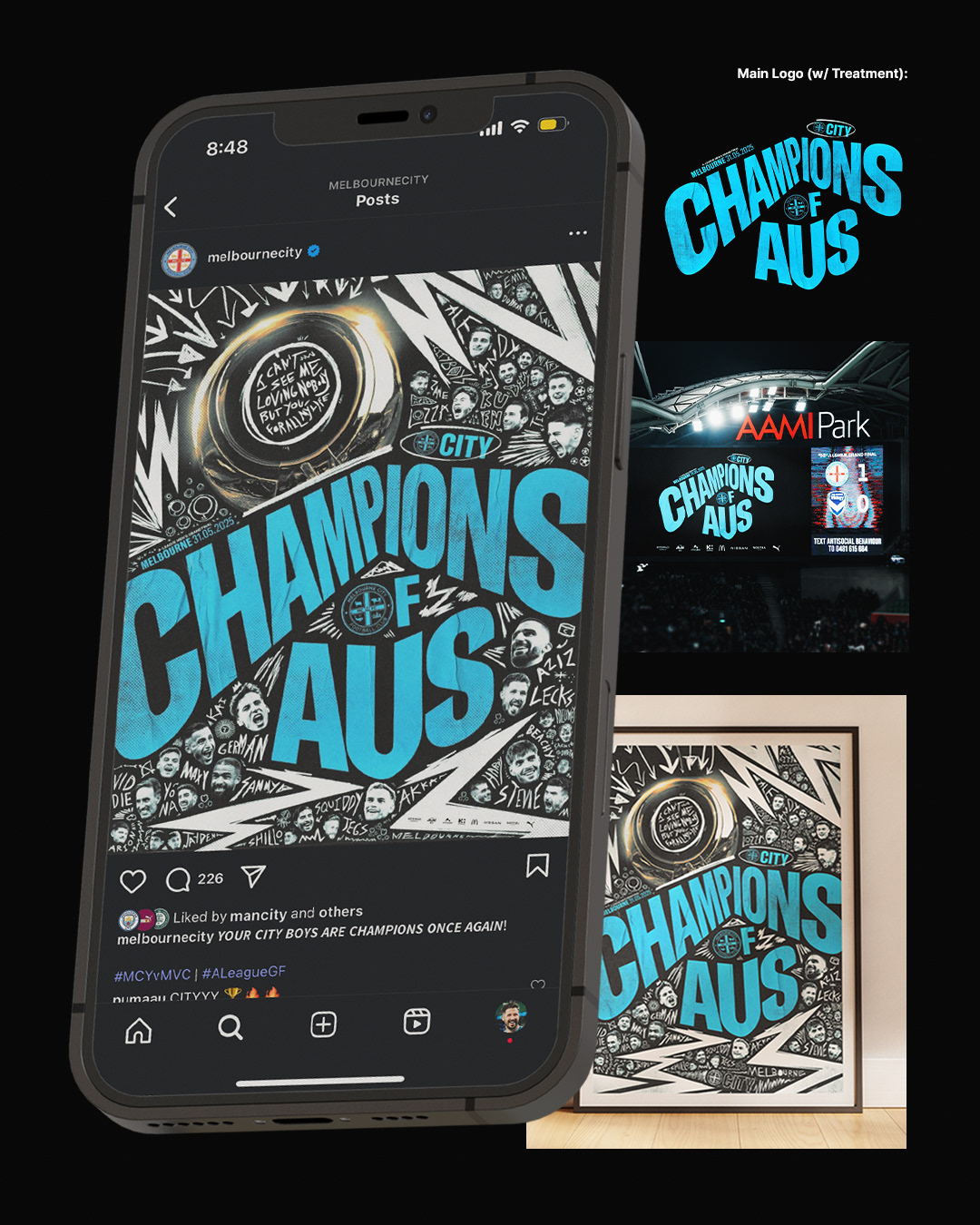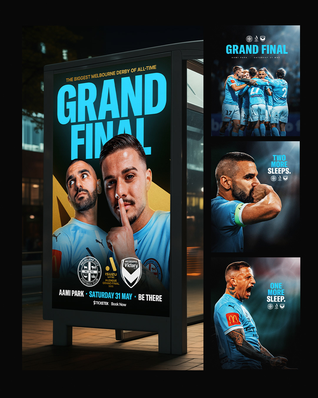 On the 31st of May 2025, Melbourne City beat their cross-town rivals Melbourne Victory in the A-League Men's Grand Final to become two-time champions, a massive event in club history. I created a catalogue of assets for this historic moment - the main social poster, merchandise range, social posts, marketing assets, and of course THAT billboard that went live over Melbournes main street post-match.